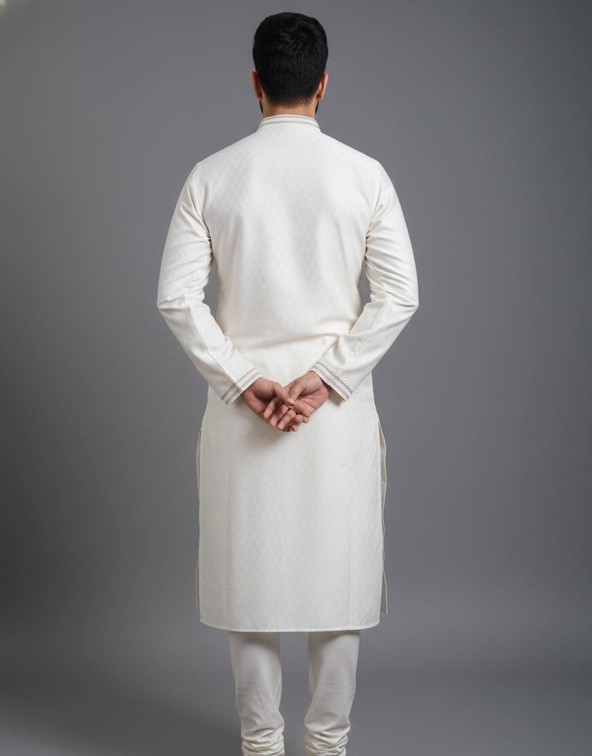 এই পাঞ্জাবিটি তৈরি করা হয়েছে উন্নত মানের ইন্ডিয়ান প্রিমিয়াম ফ্যাব্রিক দিয়ে, যা একদিকে যেমন দেখতে রাজকীয়, অন্যদিকে পরতে অসম্ভব আরামদায়ক। অফ-হোয়াইট/আইভরি রঙের ওপর সূক্ষ্ম জ্যাকোয়ার্ড টেক্সচার ডিজাইন পাঞ্জাবিটিকে দিয়েছে একদম এলিগেন্ট ও রিফাইন্ড লুক।